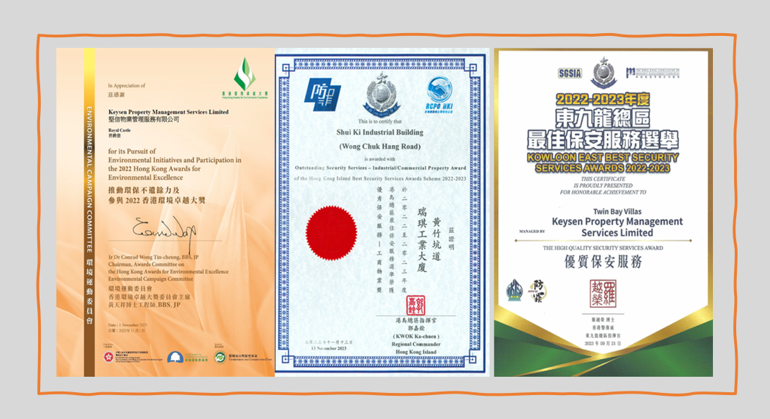 | The 1st term of Hong Kong Services Trade Alliance Outstanding Practitioners Award 2023 – “Participation Award – Keysen Property Management Co., Ltd.” | Hong Kong Services Trade Alliance | 2023 |