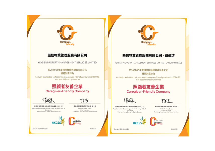 堅信物業管理服務有限公司和朗豪坊近日榮獲香港社會服務聯會頒發之 「商界展關懷2024/25」計畫的 「領先表現」及「照顧者友善企業」嘉許,而花園道三號亦榮獲「進階表現」嘉許。此項榮譽肯定了我們在關懷社區及履行企業社會責任方面的不懈努力與卓越表現。